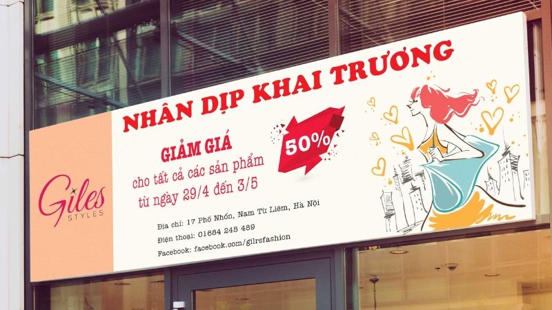- Điểm nhấn: Chương trình khuyến mãi ("Giảm giá 30% toàn bộ sản phẩm", "Tặng quà cho 100 khách hàng đầu tiên").